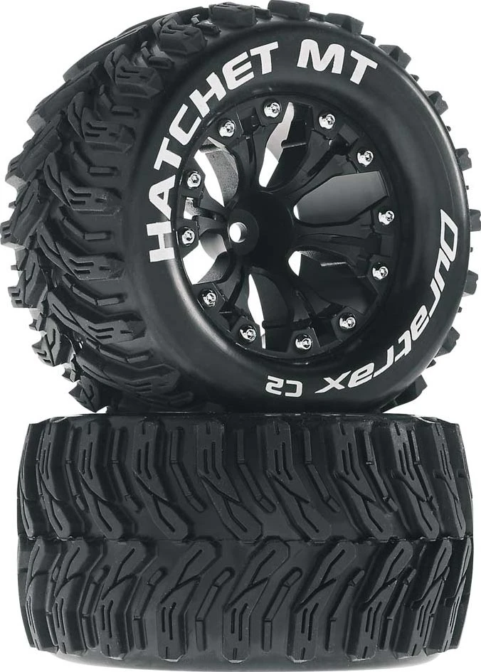 This is a pair of Duratrax 2.8" Hatchet MT Tires mounted to Black 6-Spoke Wheels with 1/2" Offset. FEATURES: Soft (C2) compound Deep V-tread displaces dirt and dust for optimal traction "Hatchet MT" and "Duratrax" printed in white on sidewall Six spoke plastic wheels, black in color INCLUDES: Two Duratrax 2.8" Hatchet MT Tires with Foam Inserts and 6-Spoke Black Wheels with 1/2" Offset SPECS: Inner Diameter: 2.8" (71mm) Outer Diameter: 4.6" (117mm) Width: 2.5" (65mm) Hex Size: 12mm Wheel Offset: 1/2" (12.7mm) jxs 08/04/15 ir/jxs