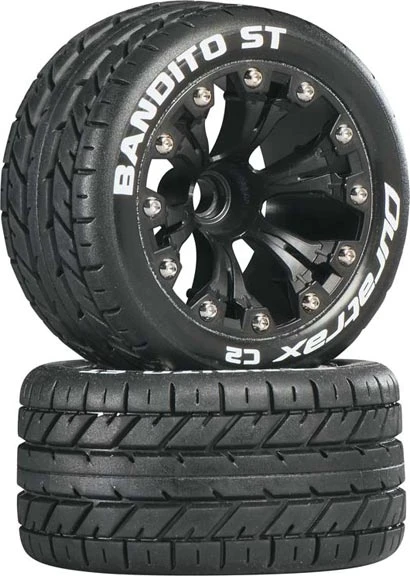 This is a pair of Duratrax Bandito ST 2.8" C2 Tires and Wheels with 0.5" (12mm) Offset. FEATURES: Fits the Front of the; Traxxas 2WD Stampede, Rustler, Monster Jam Front and Rear of the; Traxxas 2WD GP Jato, Stampede, Rustler 4WD EP Stampede, HPI Savage XS Flux C2 (soft) compound is comparible to Pro-Line M3 and AKA soft ratings Designed for asphalt, concrete, hard and smooth surfaces Ideal for high traction condtions White sidewall markings One piece foam inserts INCLUDES: Two each, Bandito ST 2.8" C2 Tires, Foam Inserts and Black Wheels SPECS: Wheel Diamter: 2.8" (71mm) Width: 1.9" (49mm) Offset: 0.5" (12mm) Hex Size: 12mm COMMENTS: Also available with Chrome Wheels by ordering DTXC3545. jxs 09/26/13 ir/jxs