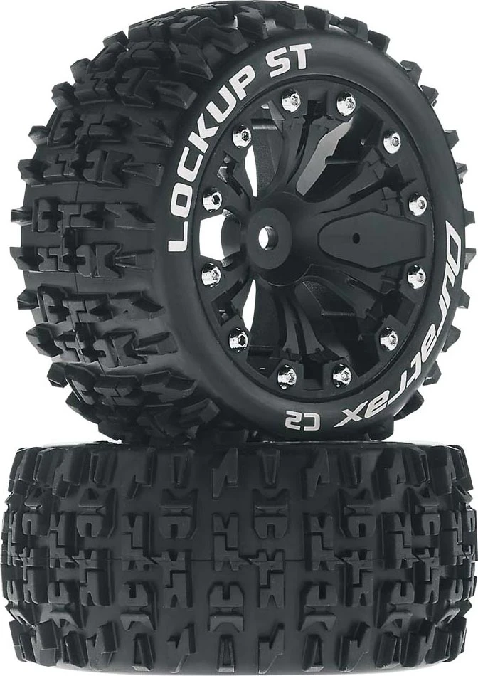 This is a pair of Duratrax 2.8" Lockup Monster Truck Tires mounted to 2WD Black Rear Wheels FEATURES: C2 (soft) compound is comparable to Pro-Line M3 and AKA Soft ratings Ideal for hard packed wet and dry, and loose dry and loamy, and wet track surfaces "Lockup ST" and "Duratrax C2" printed in white on sidewall Black plastic six split-spoke wheels INCLUDES: Two 2.8" Lockup Truck Tires with Foam Inserts mounted to 2WD Black Rear Wheels SPECS: Wheel Diameter: 2.8" (71mm) Outer Diameter: 4.2" (107mm) Width: 1.9" (48mm) jxs 08/11/15 ir/jxs