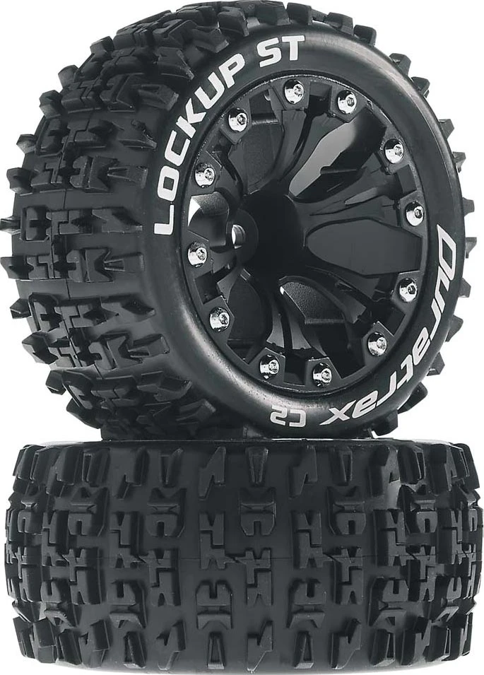 This is a pair of Duratrax 2.8" Lockup Monster Truck Tires with Foam Inserts mounted to Black Wheels. FEATURES: C2 (soft) compound is comparable to Pro-Line M3 and AKA Soft ratings Ideal for hard packed wet and dry, and loose dry and loamy, and wet track surfaces "Lockup ST" and "Duratrax C2" printed in white on sidewall Black plastic six split-spoke wheels INCLUDES: Two 2.8" Lockup Truck Tires with Foam Inserts mounted to 2WD Black Rear Wheels SPECS: Wheel Diameter: 2.8" (71mm) Outer Diameter: 4.2" (107mm) Width: 1.9" (48mm) Offset: 0.5" (12mm) jxs 08/11/15 ir/jxs