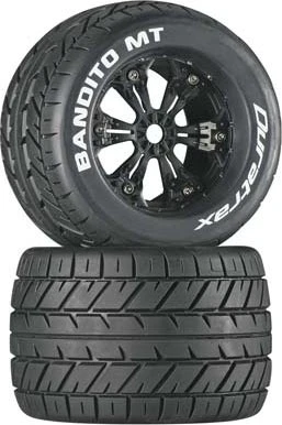 This is a pair of Duratrax 3.8" Bandito MT Tires mounted to Black 6-Spoke Wheels. FEATURES: Fits the front and rear of the Traxxas E-Maxx, Revo 3.3, HPI Savage XL, Savage X4.6 and Savage Flux Sport (CS) compound Ideal for hard packed and abrasive dry track surfaces "Bandito MT" and "Duratrax" printed in white on sidewall Six spoke plastic wheels, black in color INCLUDES: Two Duratrax 3.8" Bandito MT Tires with Foam Inserts and 6-Spoke Wheels SPECS: Inner Diameter: 3.8" (96mm) Outer Diameter: 6.5" (165mm) Width: 4.1" (104mm) Hex Size: 17mm jxs 05/06/14 ir/jxs