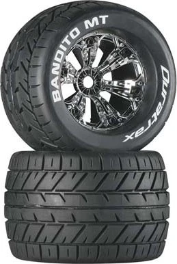 This is a pair of Duratrax 3.8" Bandito MT Tires mounted to Chrome 6-Spoke Wheels with 12mm Offset. FEATURES: Fits the front and rear of the Traxxas E-Revo, Summit and T-Maxx Sport (CS) compound Ideal for hard packed and abrasive dry track surfaces "Bandito MT" and "Duratrax" printed in white on sidewall Six spoke plastic wheels with chrome finish INCLUDES: Two Duratrax 3.8" Bandito MT Tires with Foam Inserts and 6-Spoke Wheels with 12mm Offset SPECS: Inner Diameter: 3.8" (96mm) Outer Diameter: 6.5" (165mm) Width: 4.1" (104mm) Hex Size: 17mm Offset: 0.5" (12mm) jxs 05/09/14 ir/jxs