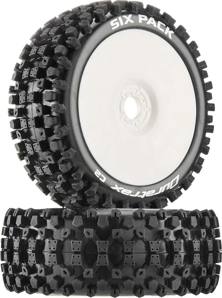 This is a pair of 1/8 scale Six Pack Buggy Tires and White Dish Buggy Wheels from Duratrax. FEATURES: Keystone shaped lugs on each outer edge with rectangular center lugs Unique hub pattern for improved wheel nut grip Tires molded from worldwide race-winning long lasting C2 compound Sidewall markings with tire type and firmness compound for easy identification at a glance Resealable packaging INCLUDES: Two 1/8 scale Six Pack Buggy Tires with Foam Inserts, DTXC3738 Two White Dish Wheels SPECS: Outer Diameter: 4.25" (108mm) Width: 1.6" (41.5mm) Hex Size: 17mm jxs 08/02/17 ir/jxs