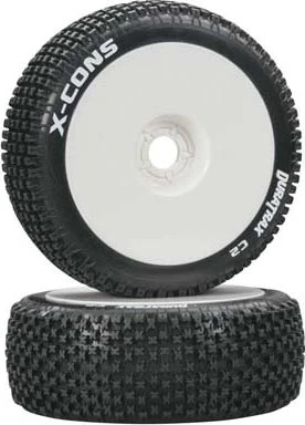 This is a pair of 1/8 scale X-Cons Buggy Tires and Wheels from DuraTrax. FEATURES: X-pin pattern ideal for loose (dry and loamy), hard packed (wet), and abrasive (dry) track surfaces Premounted to dish style wheels molded in white with unique hub pattern that provides a better wheel nut grip Molded from worldwide race-winning long lasting C2 compound Color-coded sidewall markings make it easy to identify each tread pattern at a glance Resealable packaging INCLUDES: Two 1/8 scale X-Cons Buggy Tires with Foam Inserts and Wheels REQUIRES: Mounting to vehicle SPECS: Outer Diameter: 4.25" (108mm) Width: 1.6" (41.5mm) Hex Size: 17mm COMMENTS: Tires available separately, DTXC3710 jxs 11/10/10 ir/jxs
