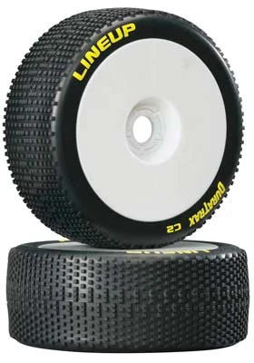 This is a pair of 1/8 scale Lineup Buggy Tires and Buggy Wheels from DuraTrax. FEATURES: Square pin pattern ideal for hard packed (dry), blue groove (fast) and indoor clay (damp) track surfaces Premounted to dish style wheels molded in white with unique hub pattern that provides a better wheel nut grip Tires molded from worldwide race-winning long lasting C2 compound Color-coded sidewall markings make it easy to identify each tread pattern at a glance Resealable packaging INCLUDES: Two 1/8 scale Lineup Buggy Tires with Foam Inserts and Buggy Wheels REQUIRES: Mounting to vehicle SPECS: Outer Diameter: 4.25" (108mm) Width: 1.6" (41.5mm) Hex Size: 17mm jxs 11/10/10 ir/jxs