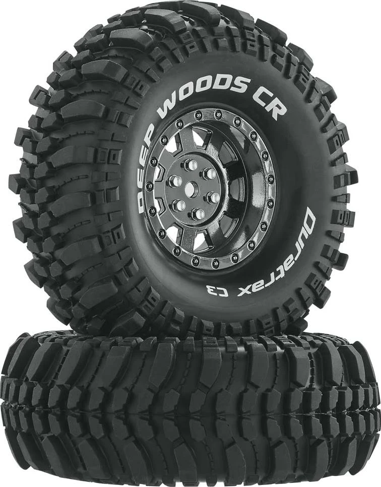 This is a pair of Duratrax Deep Woods 1.9" Scale/Crawler Tires in C3 Compound mounted to Wheels with Black/Chrome Finish. FEATURES: Aggressive tread for high degree of traction "Deep Woods CR" and "Duratrax C3" white lettering on sidewall Duratrax C3 compound compares to the Pro-Line M4 super soft, and the AKA Super Soft compound Wheels constructed of molded plastic with black/chrome finish INCLUDES: Two Deep Woods 1.9" Tires in C3 Compound with Foam Inserts Two 1.9" Crawler Wheels, DTXC3856 SPECS: Outer Diameter: 4.6" (117mm) Width: 1.6" (42mm) Inner Diameter: 1.9" (48.26mm) Hex Size: 12mm jxs 06/09/16 ir/jxs