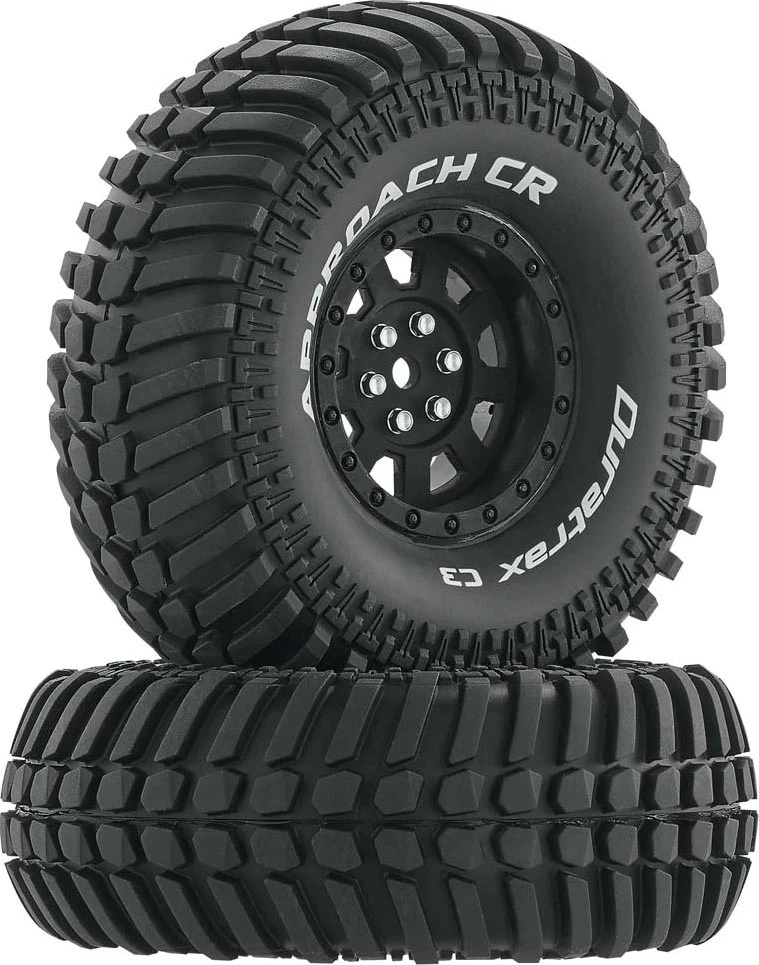 This is a pair of Duratrax Approach 1.9" Scale/Crawler Tires in C3 Compound. mounted to 1.9" Wheels FEATURES: Moderately aggressive tread "Approach CR" and "Duratrax C3" white lettering on sidewall Duratrax C3 compound compares to the Pro-Line M4 super soft, and the AKA Super Soft compound Wheels constructed of molded plastic, black in color INCLUDES: Two Approach 1.9" Tires in C3 Compound with Foam Inserts mounted to 1.9" Crawler Wheels, DTXC3855 SPECS: Outer Diameter: 4.6" (117mm) Width: 1.6" (42mm) Hex Size: 12mm jxs 05/16/16 ir/jxs