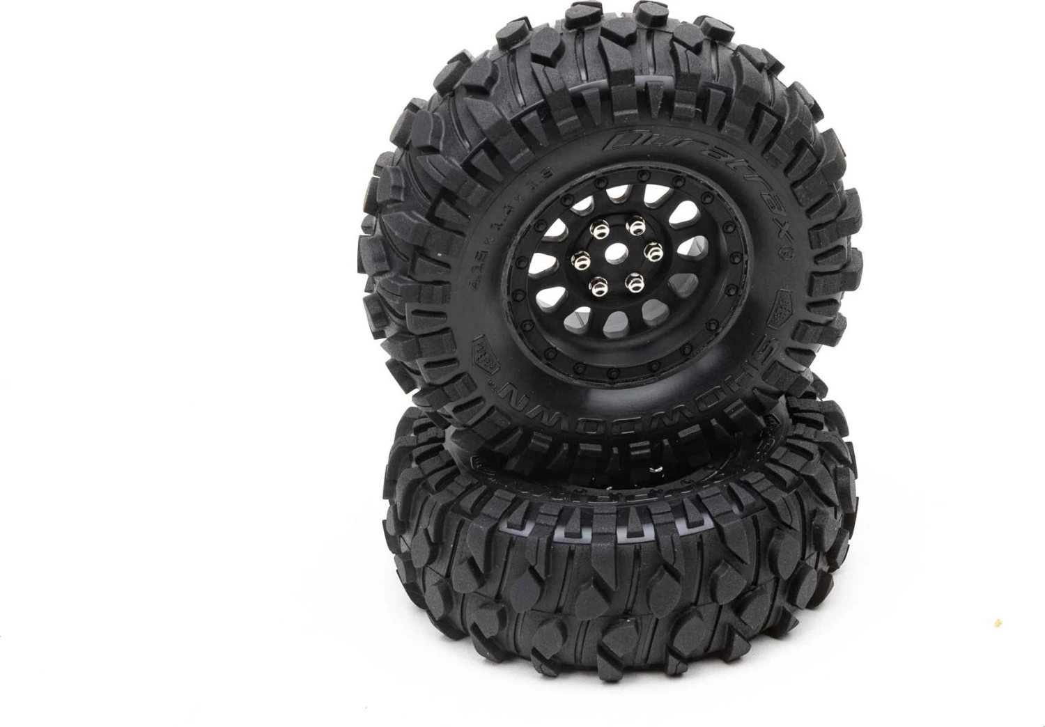 These Duratrax® SHOWDOWN front and rear tires are Class 1 (4.19″ outer diameter) size for maximum scale appearance, with a 1.9″ inner tire/outer wheel diameter. Made from super-soft C3 compound rubber with an aggressive tread that bites into loose or muddy surfaces, these tires provide exceptional gripping power for climbing over slippery rocks and getting past the toughest obstacles. They include foam inserts and arrive factory-mounted to 12mm hex wheels that are molded from a durable black composite plastic. Sold in pairs.