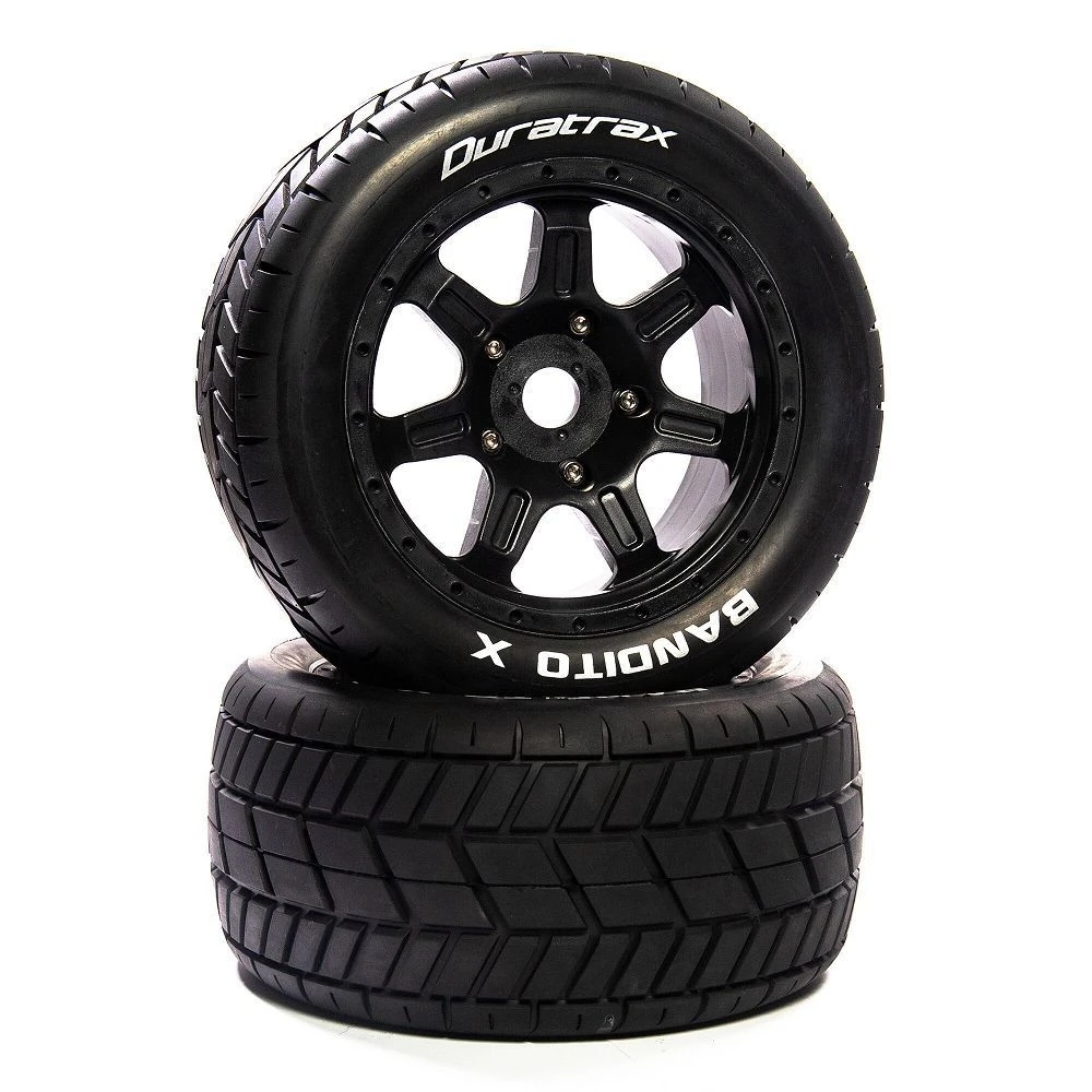 For the times you’re not thrashing your truck through loose dirt and mud Duratrax offers these factory mounted 1/5 scale BANDITO MT front/rear tires for the ARRMA KRATON 8S monster truck and ARRMA OUTCAST 8S stunt truck. They feature a tread pattern that’s perfect for running on pavement, hard-packed clay, and similar conditions. Molded from a durable black composite plastic, the 24mm hex wheels measure 3.9 inches (98.2mm) wide and 8.0 inches (203.9mm) in diameter. The tires include one-piece foam inserts and are made from medium firm CS Sport compound. Sold in pairs.