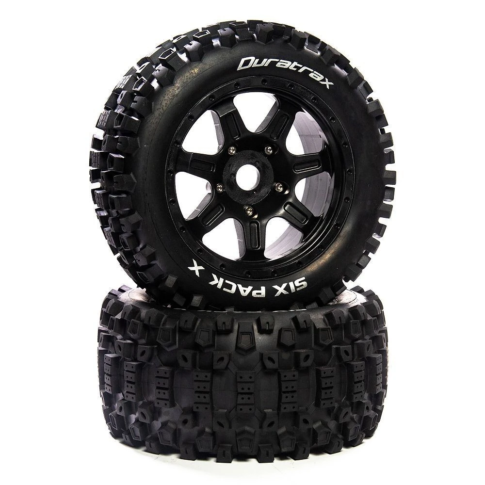 Duratrax offers these factory mounted 1/5 scale SIX PACK MT front/rear tires for the ARRMA KRATON 8S monster truck and ARRMA OUTCAST 8S stunt truck. They feature a tread pattern perfect for running on a wide range of surfaces: pavement, hard-packed wet or dry surfaces, loose-dry loamy dirt, loose-wet mud and grass. Molded from a durable black composite plastic, the 24mm hex wheels measure 3.9 inches (98.2mm) wide and 8.4 inches (213mm) in diameter. The tires include one-piece foam inserts and are made from medium firm CS Sport compound. Sold in pairs.
