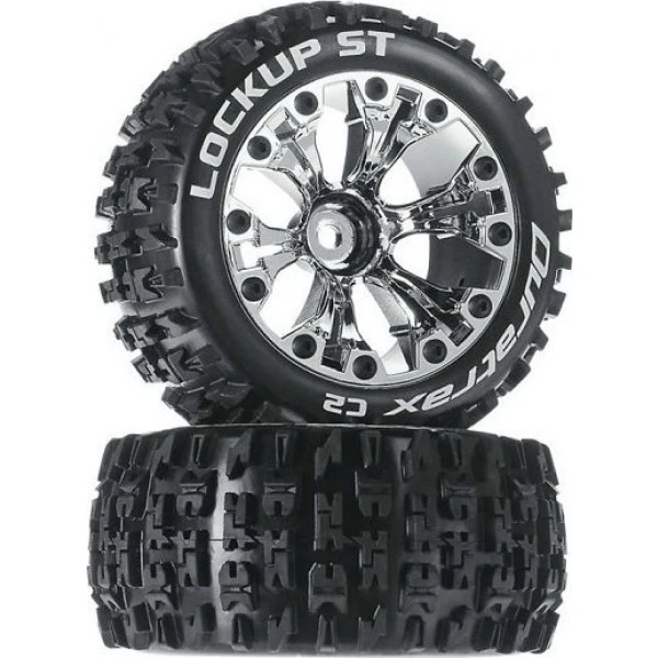 A set of two (2) Duratrax 2.8 Lockup Monster Truck tires with foam inserts mounted to chrome wheels.