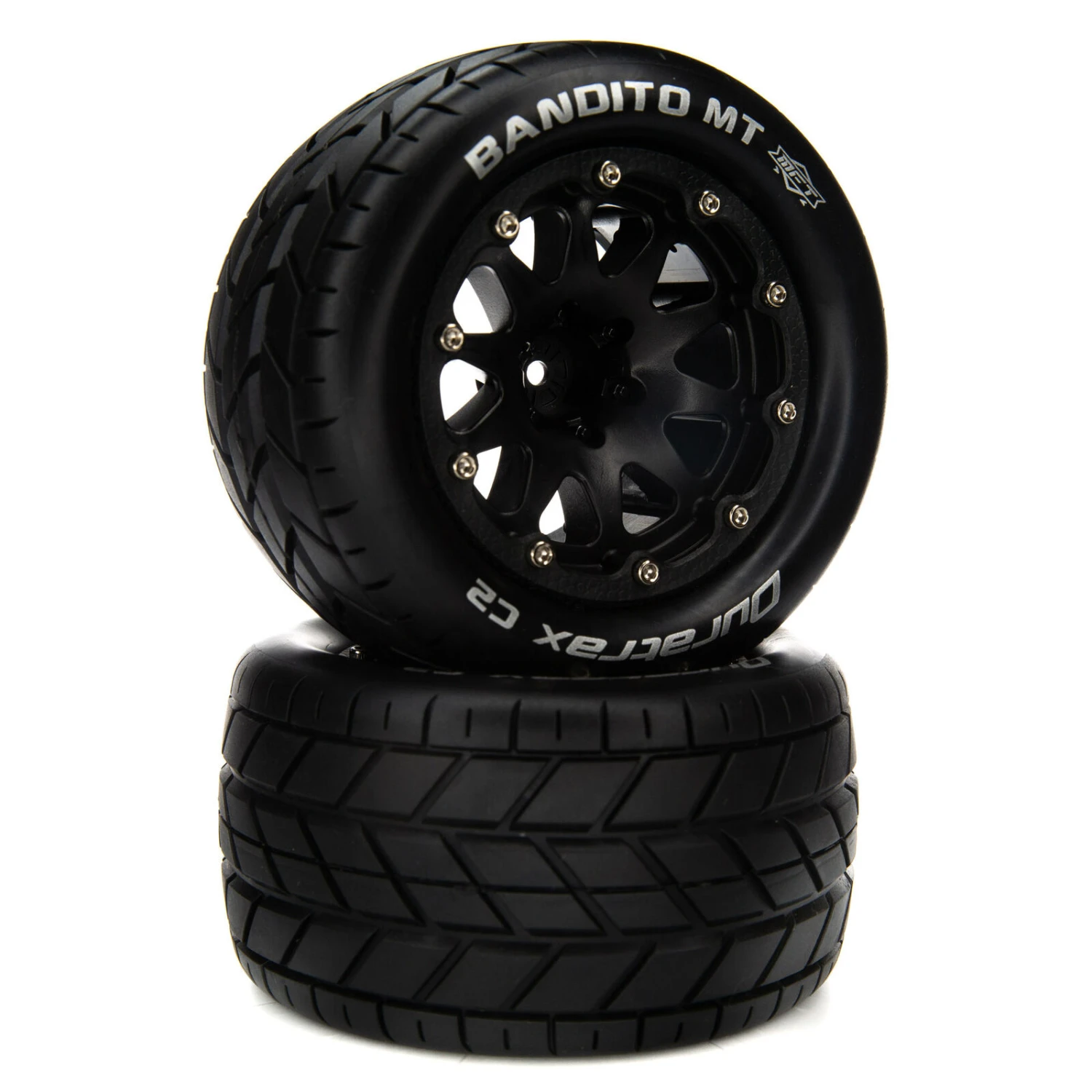 Factory-mounted, these Duratrax® BANDITO™ MT front/rear tires for the 1/10 scale ARRMA® GRANITE™ 4X4 BLX Monster Truck feature a tread pattern that’s perfect for running on pavement, hard-packed clay, and similar conditions. Molded from a durable black composite plastic, the 14mm hex wheels measure 2.8 inches (70.2mm) wide and 5.3 inches (134.1mm) in diameter. The belted tires include one-piece foam inserts and white sidewall markings, and are made from high-traction C2 soft compound. Sold in pairs.