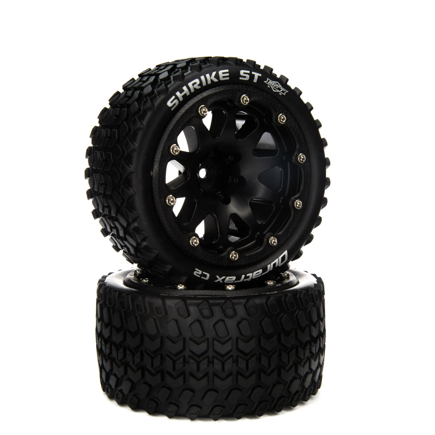 Factory-mounted, these Duratrax® SHRIKE™ ST front/rear tires for the 1/10 scale ARRMA® GRANITE™ 4X4 BLX Monster Truck feature a tread pattern that’s perfect for running on a wide range of surfaces — including asphalt, grass, and loose or hard-packed soil — and in wet or dry conditions. Molded from a durable black composite plastic, the 14mm hex wheels measure 2.8 inches (56.3mm) wide and 4.7 inches (119.1mm) in diameter. The belted tires include one-piece foam inserts and white sidewall markings, and are made from high-traction C2 soft compound. Sold in pairs.