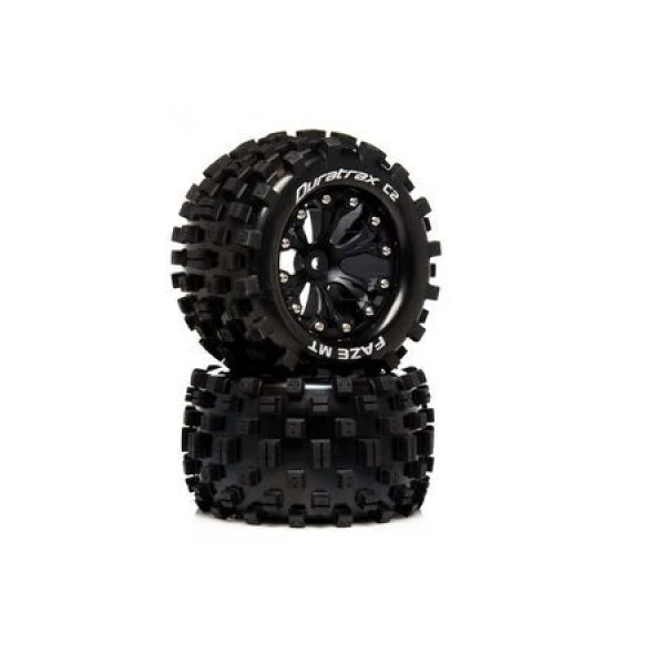 Factory-mounted with zero offset, these Duratrax® FAZE™ MT front/rear tires for 1/10 scale 2WD monster trucks feature a tread pattern that’s ideal for a wide variety of surfaces — pavement, hard-packed dry and wet tracks, grass, mud, and loose, dry and loamy surfaces. The wheels are molded from a durable black composite plastic with a 12mm hex and 2.7 inch (69.4mm) width. The tires are made from high-traction, C2 soft compound and are 4.9 inches (123.6mm) in diameter. Sold in pairs.
