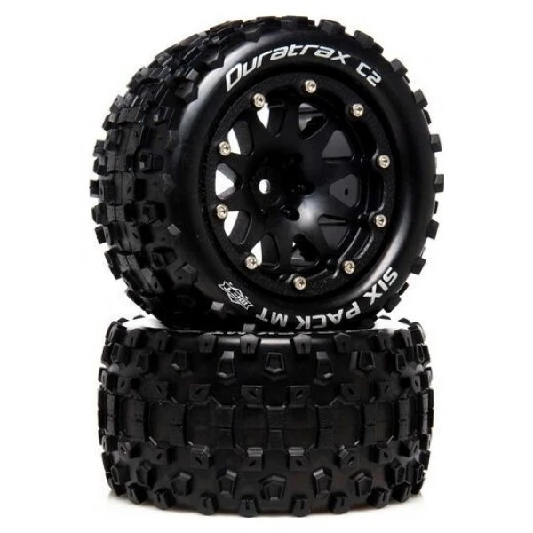 A set of two (2) Duratrax part #DTXC5520, Six Pack MT Belted 2.8″ 2WD Mounted Rear Tires, 0.5 Offset, Black