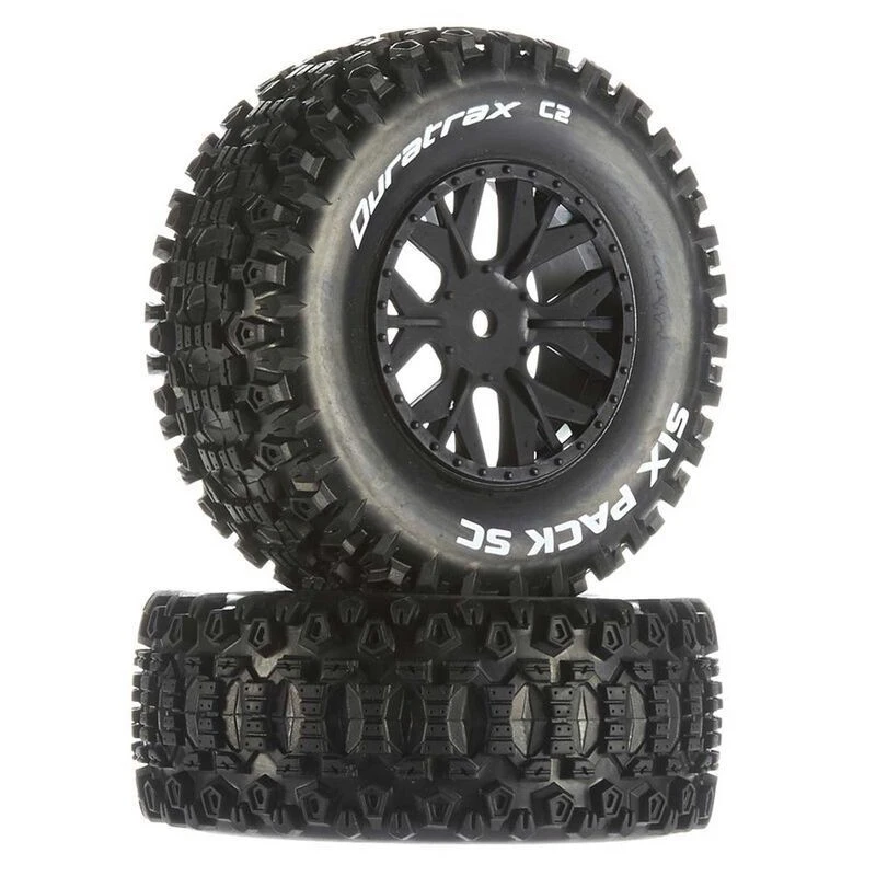 A set of two (2) Duratrax part #DTXC3864, Front/Rear Six-Pack SC 12mm 2.8″ C2 Mounted Tires for the Associated SC10 4×4