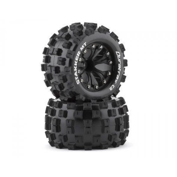 Factory-mounted with a .5 offset, these Duratrax® STAKKER™ MT front/rear tires for 1/10 scale 2WD monster trucks feature an aggressive Motocross tread pattern that’s well-suited for racing and bashing. They’re ideal for a wide variety of surfaces — pavement, hard-packed dry and wet tracks, grass, mud, and loose, dry and loamy surfaces. The wheels are molded from a durable black composite plastic with a 12mm hex and 2.7 inch (69.4mm) width. The tires are made from high-traction, C2 soft compound and are 4.9 inches (123.6mm) in diameter. Sold in pairs.