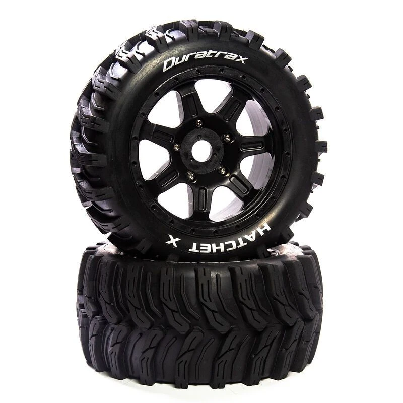 Duratrax offers these factory mounted 1/5 scale HATCHET MT front/rear tires for the ARRMA KRATON 8S monster truck and ARRMA OUTCAST 8S stunt truck. They feature a tread pattern perfect for running on a wide range of surfaces: loose dry loamy dirt, wet mud; hard-packed wet dirt and grass. Molded from a durable black composite plastic, the 24mm hex wheels measure 3.9 inches (98.2mm) wide and 8.4 inches (213mm) in diameter. The tires include one-piece foam inserts and are made from medium firm CS Sport compound. Sold in pairs.