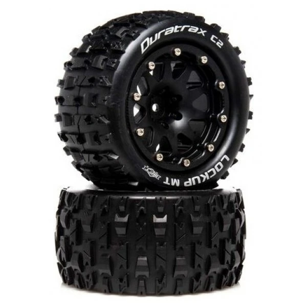 A set of two (2) Duratrax part #DTXC5518, Lockup MT Front/Rear Belted 2.8″ 2WD Mounted Tires, 0.5 Offset, Black