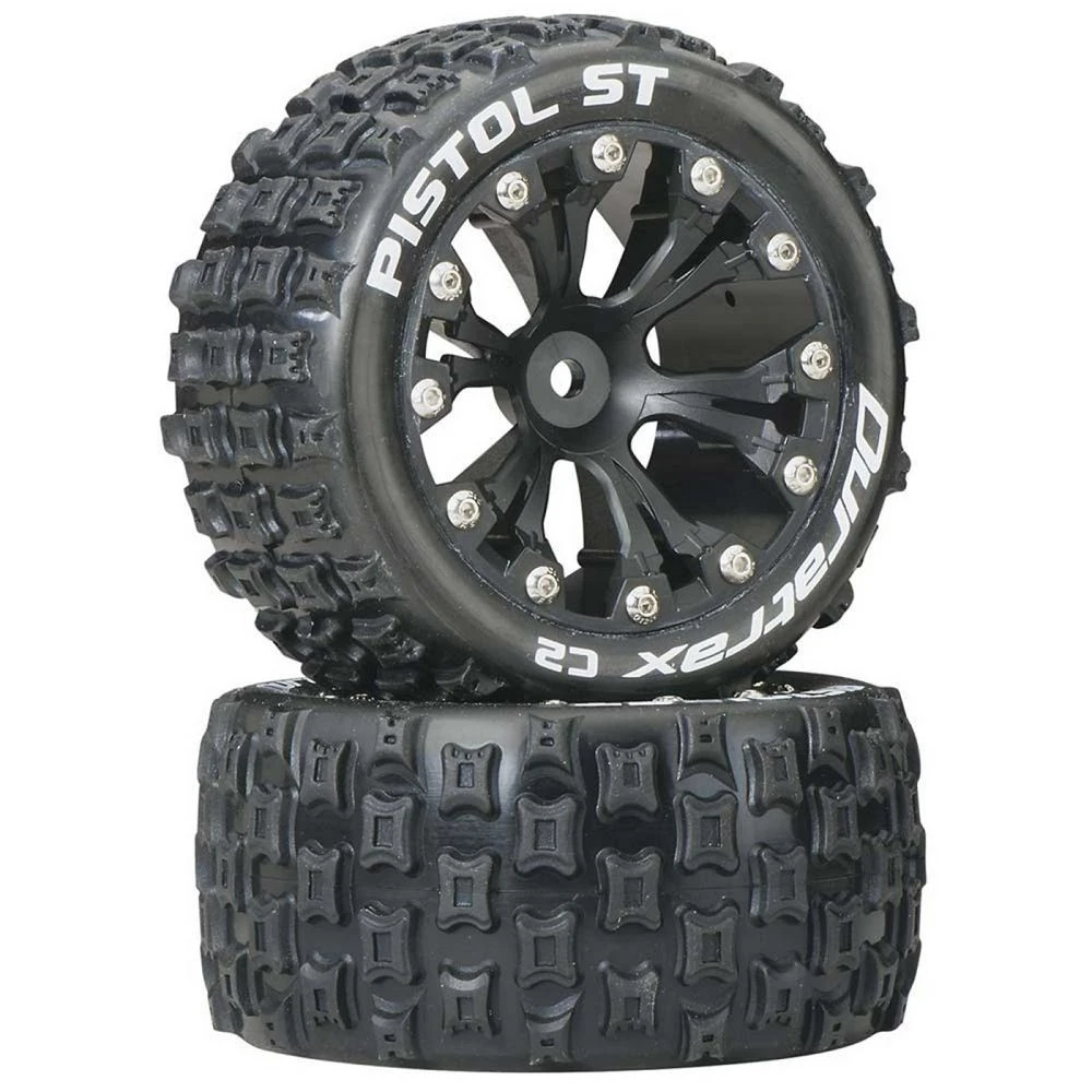 A set of two (2) Duratrax part #DTXC3554, Pistol ST 2.8″ 2WD Mounted Rear C2 (soft) Tires, Black
